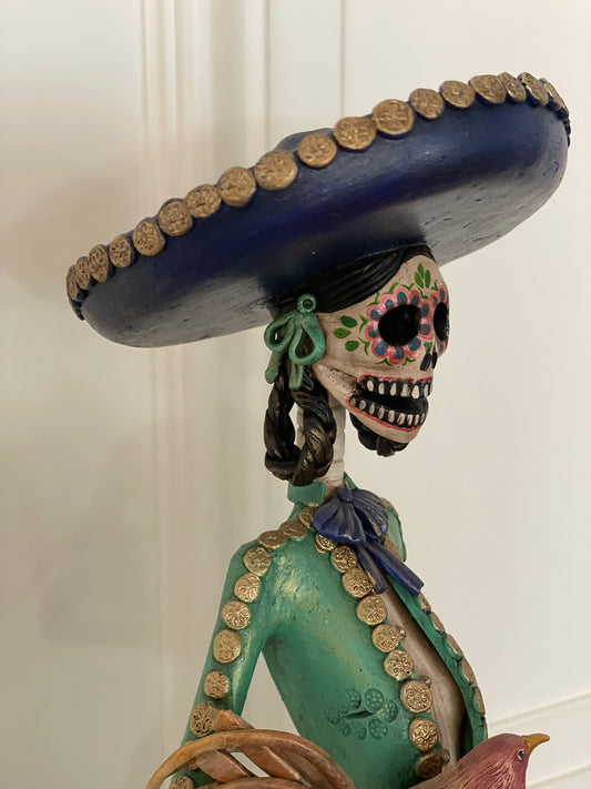 Catrina Charra con vestido verde, de cerámica de barro pintada a mano