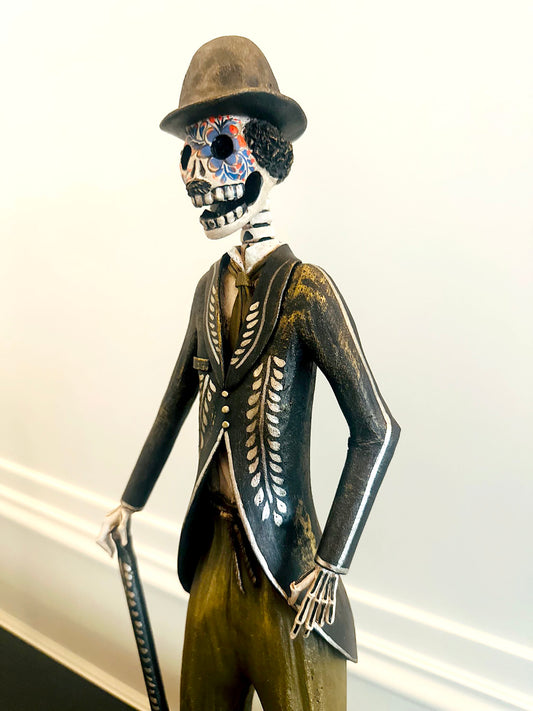 Catrina Charlie Chaplin de ceramica de barro pintada y esculpida a mano