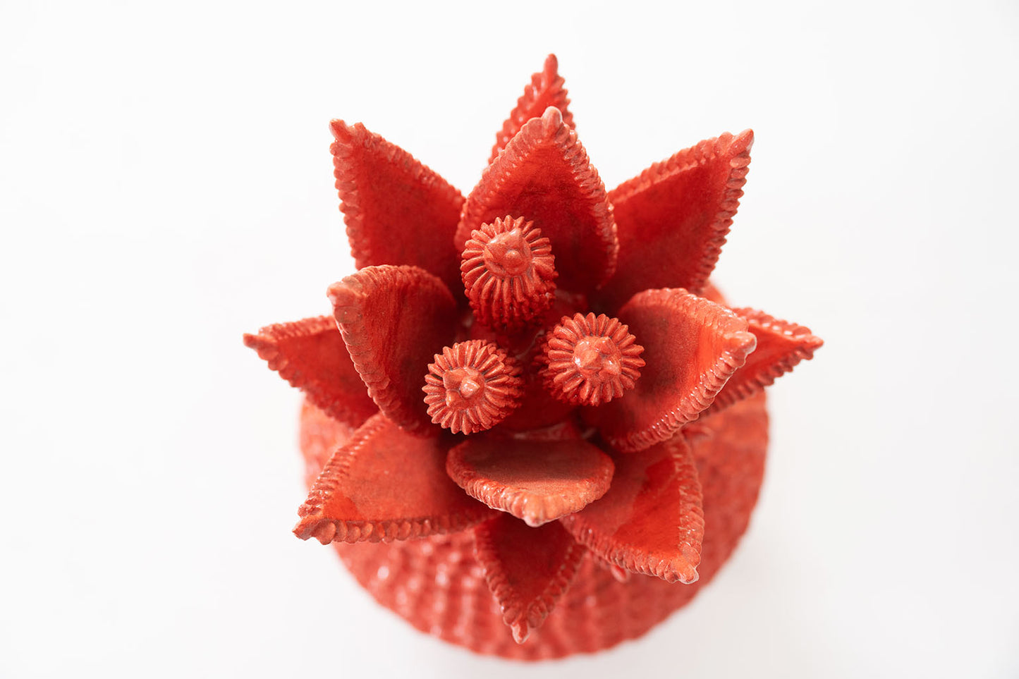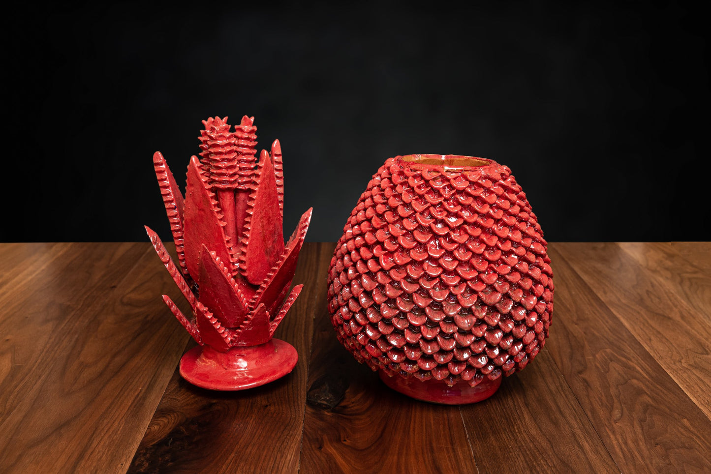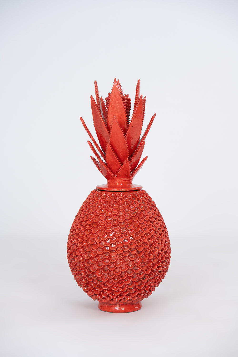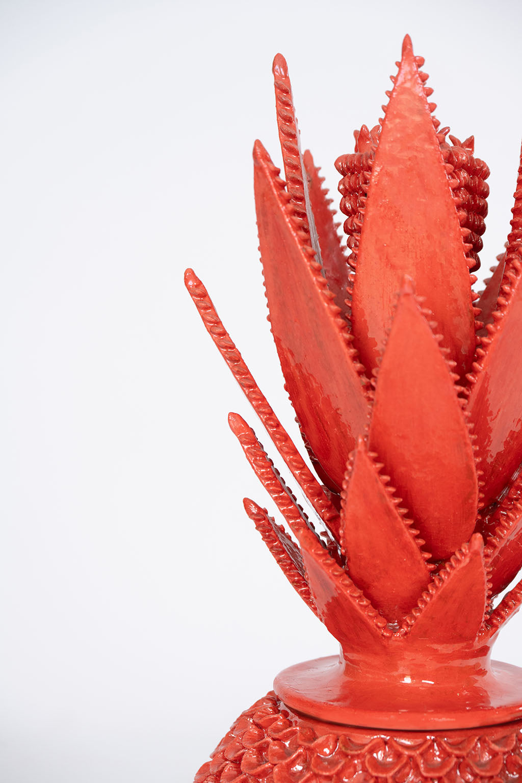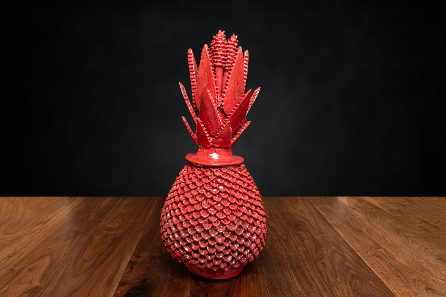 Handmade enameled clay Pineapple sculpture. Designed with red color petals.