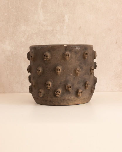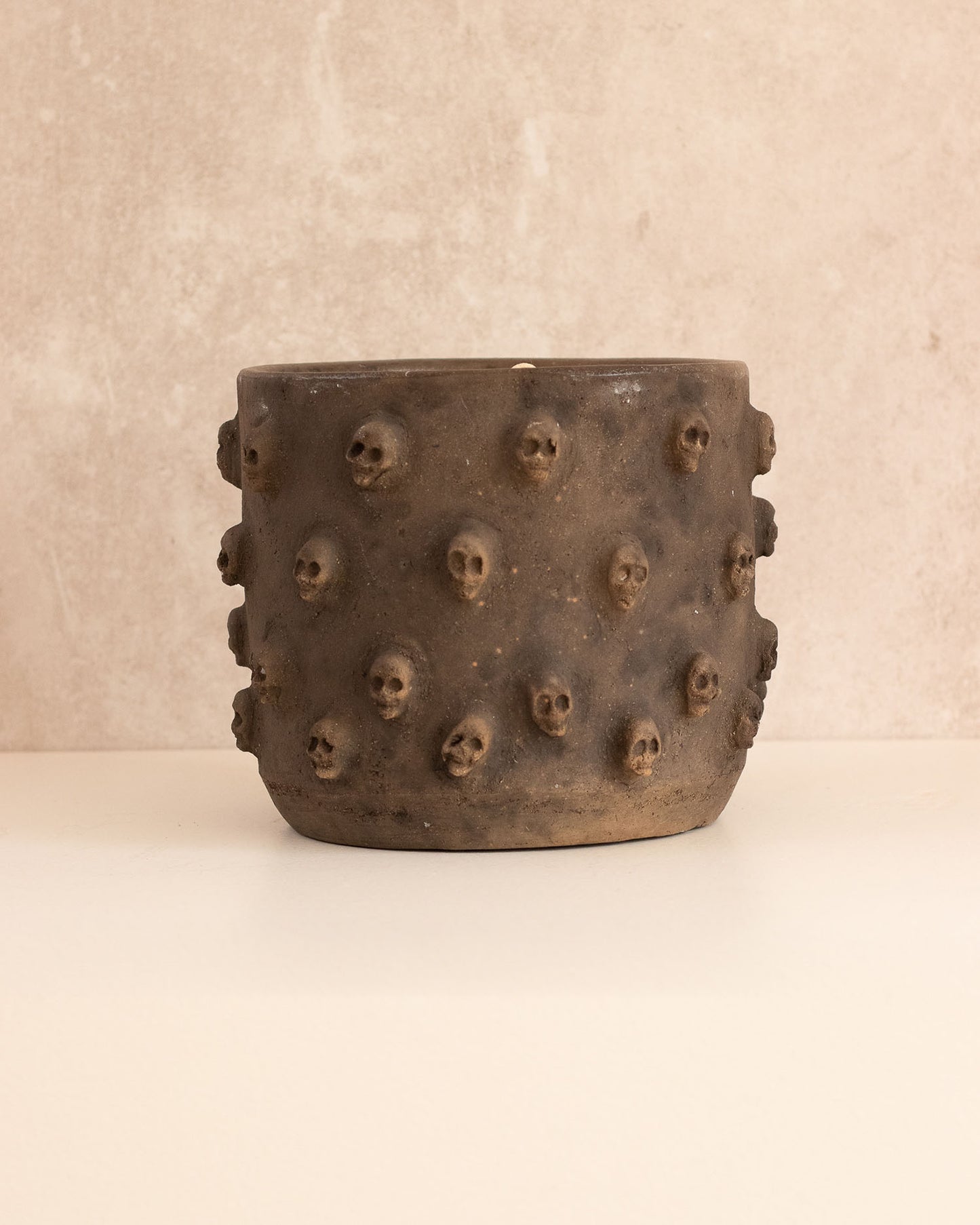 Ceramic candle holder with skull design.
