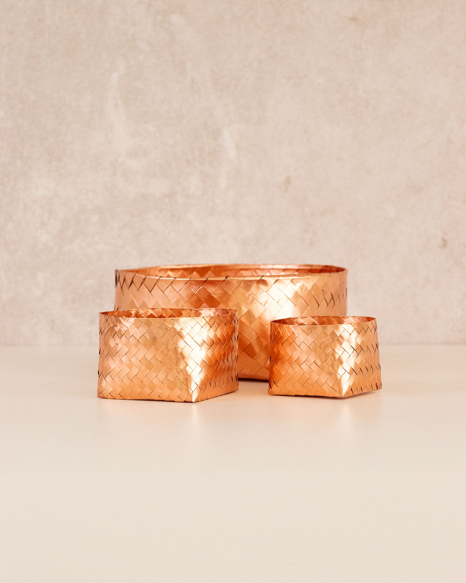 Canastas trenzadas de lámina de cobre.